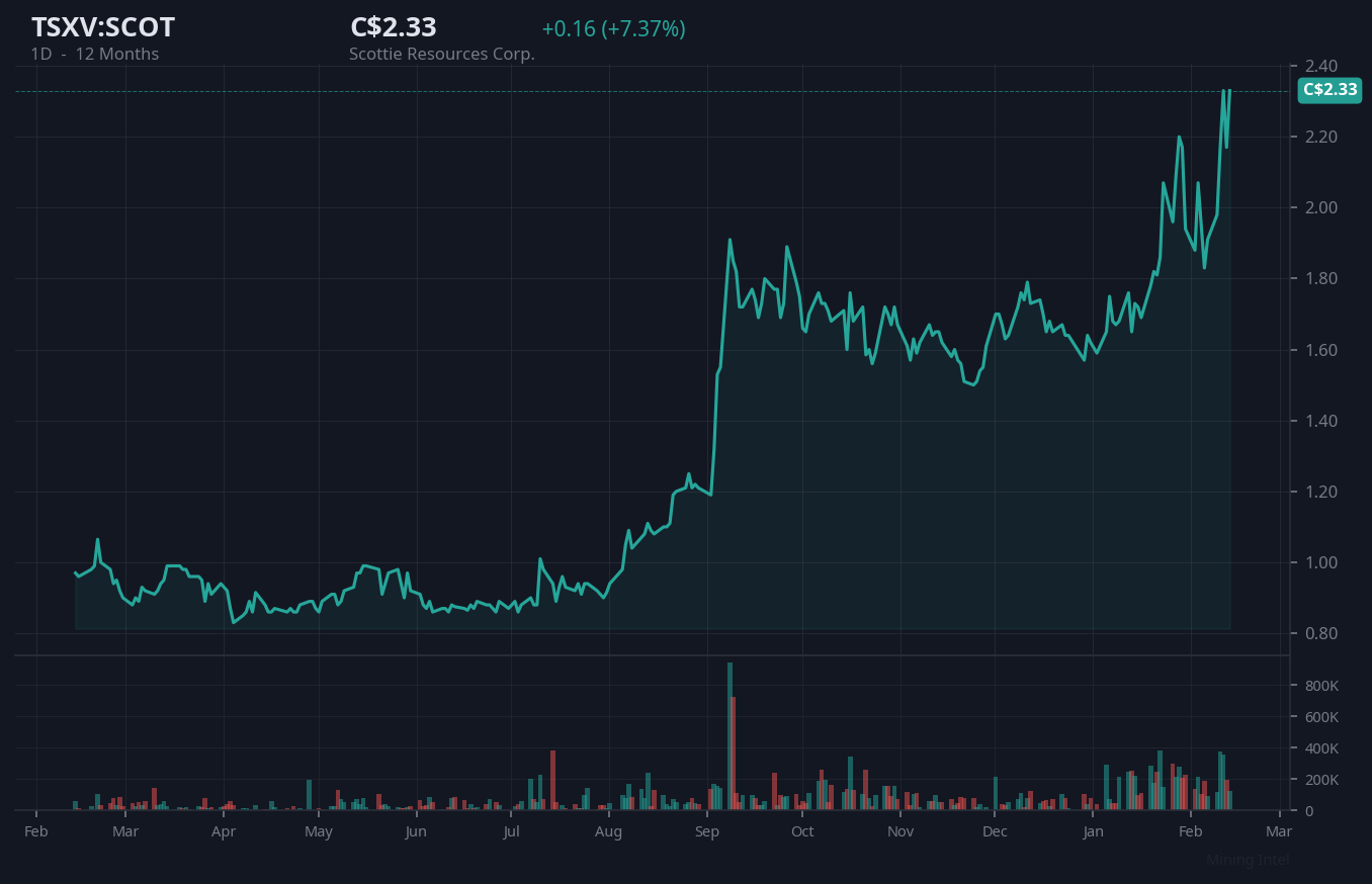 Property (9/10): The Scottie Gold Mine is a past-producing, high-grade, vein-hosted gold deposit in the prolific Golden Triangle of British Columbia. The Blueberry Contact Zone continues to deliver bonanza-grade intercepts that expand the known mineralization. The October 2025 PEA outlined a 7-year mine life with a C$215.8M after-tax NPV. The deposit remains open along strike and at depth, suggesting significant resource growth potential.
